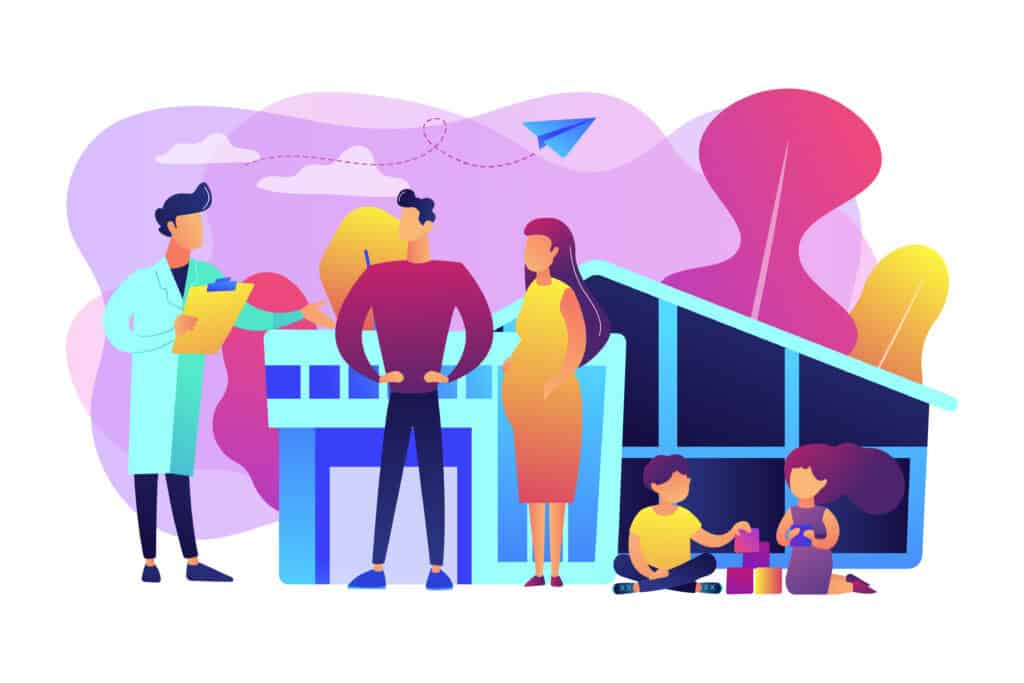 Family phisician with husband, pregnant wife and playing children. Family doctor, medical family practice, primary healthcare care concept. Bright vibrant violet vector isolated illustration